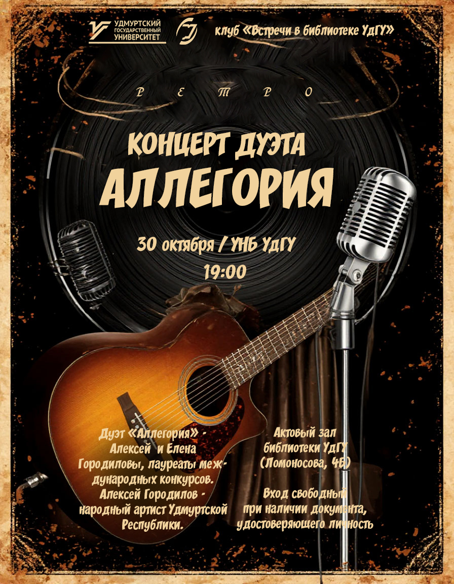 30 октября в актовом зале Учебно-научной библиотеки им. В. А. Журавлёва выступит дуэт «Аллегория» с ретро-программой. Копысов Е. А. подробнее...
